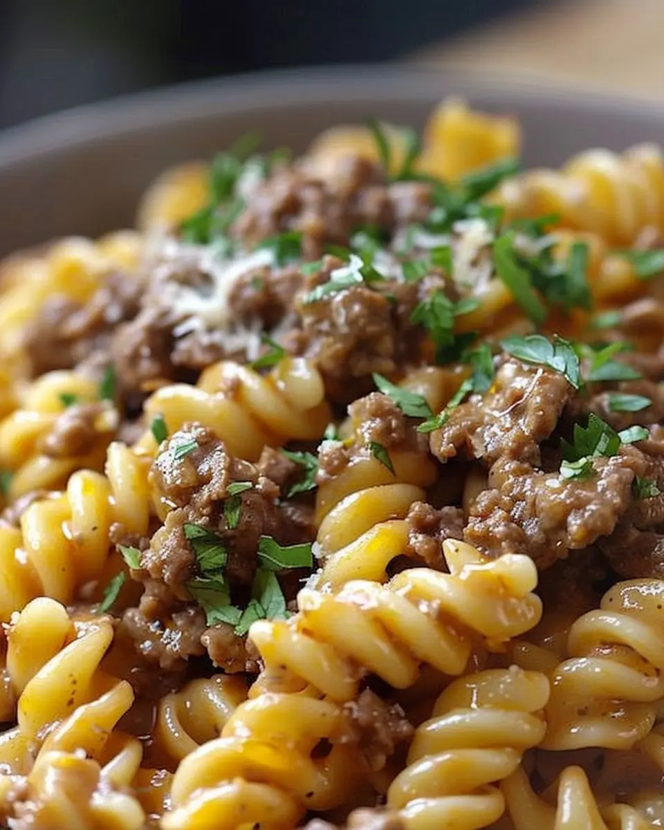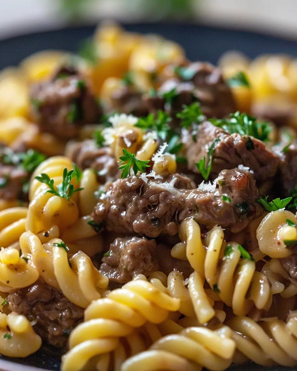 Beef and Rotini in Garlic Parmesan Sauce: An Easy Comfort Dish