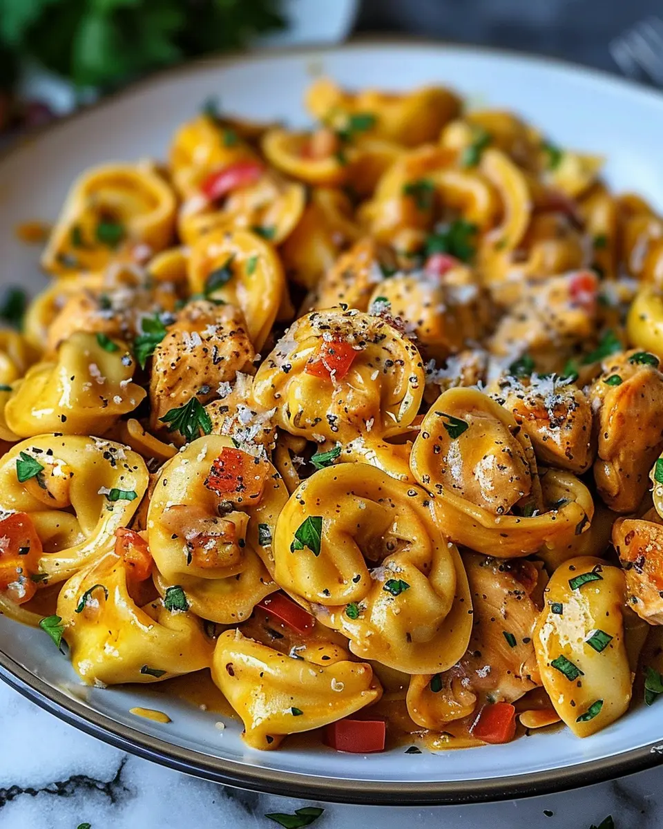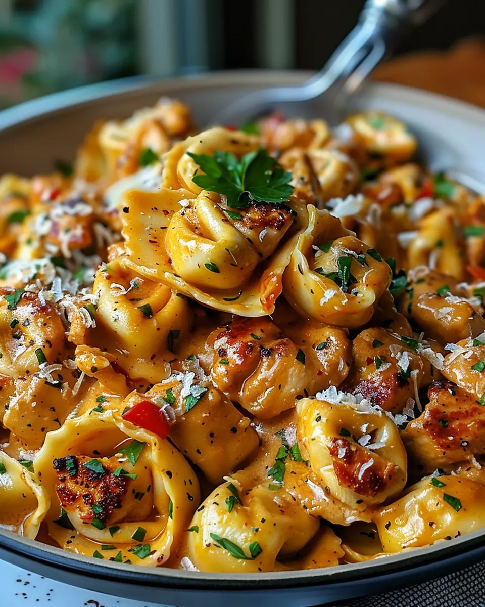 An indulgent and flavorful recipe featuring savory garlic butter chicken and tortellini.