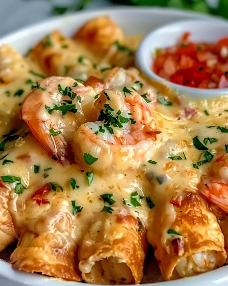 Once your Crab Shrimp Queso wraps are golden brown, it’s time to serve! Slice them in halves or quarters and arrange them on a platter. Offer sides like salsa, guacamole, or sour cream for dipping. And don’t forget to sprinkle some chopped cilantro or green onions on top for that extra pop of flavor.