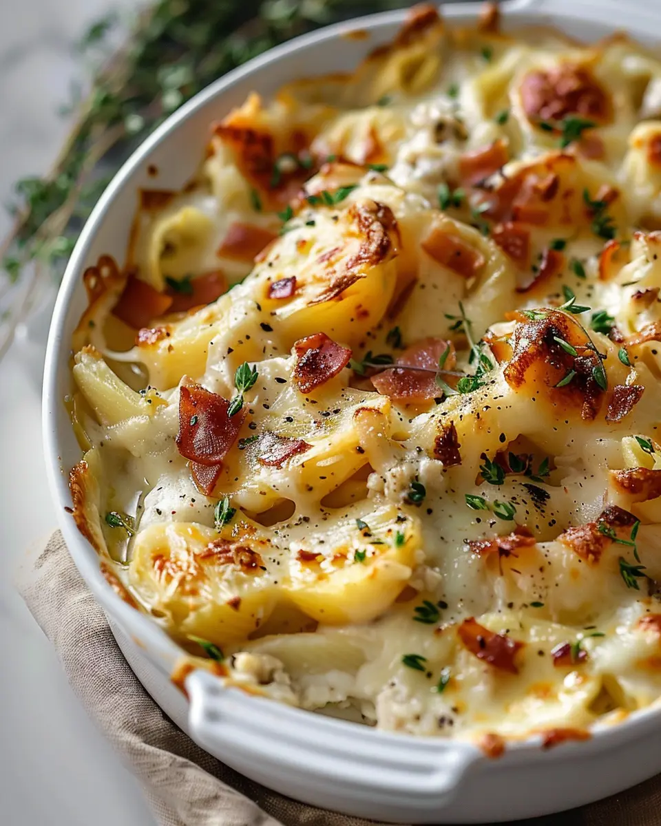 A deliciously satisfying casserole featuring turkey bacon and chicken ham.