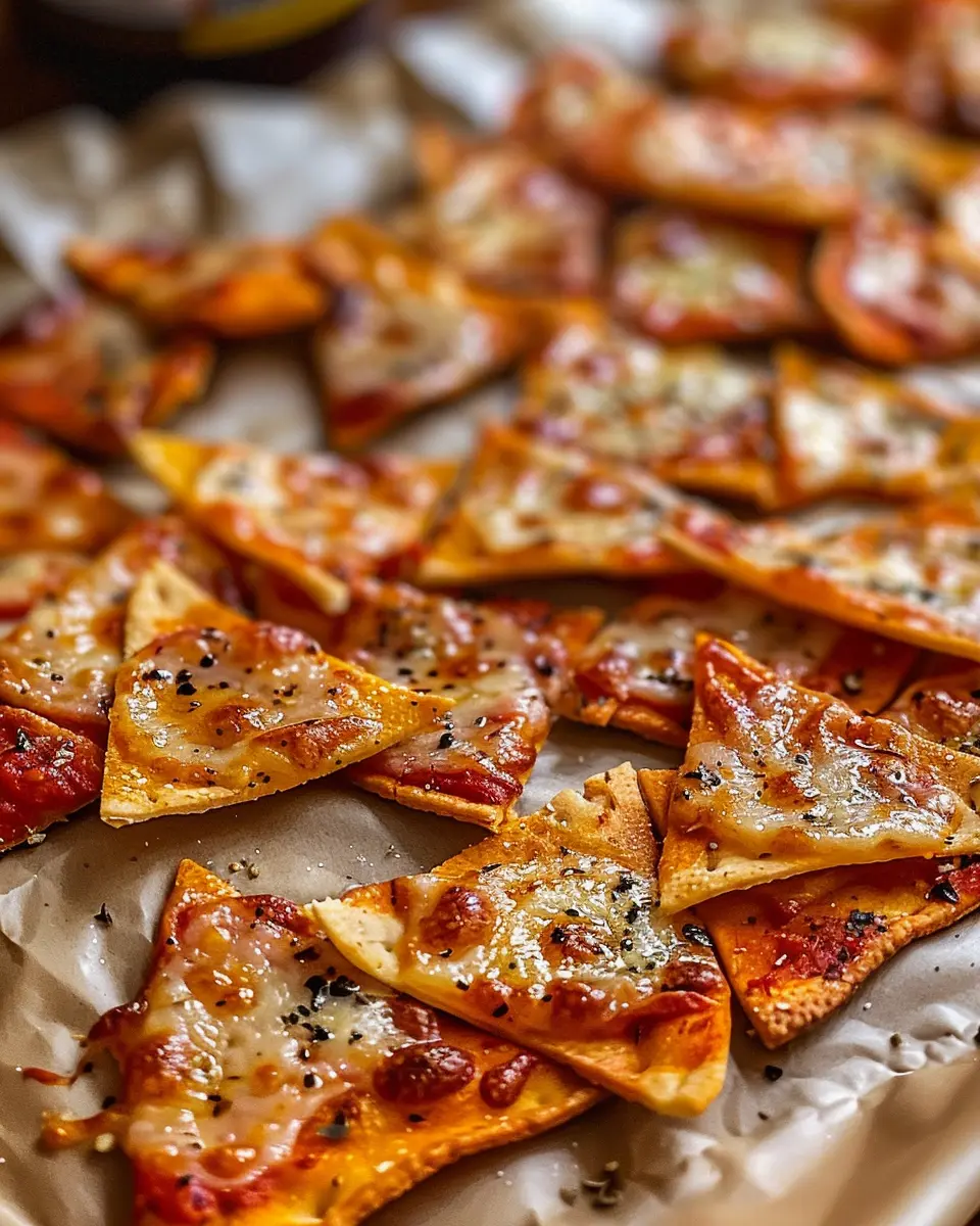 Presentation is key! Serve your crispy pizza chips in a fun, bold bowl or on a wooden platter for a rustic look. Consider layering the chips with toppings like chopped herbs or a sprinkle of parmesan for a gourmet touch. To brighten up your snack table, garnish with colorful veggies like cherry tomatoes or bell pepper strips. These simple enhancements make your snack feel special and elevate any gathering.
