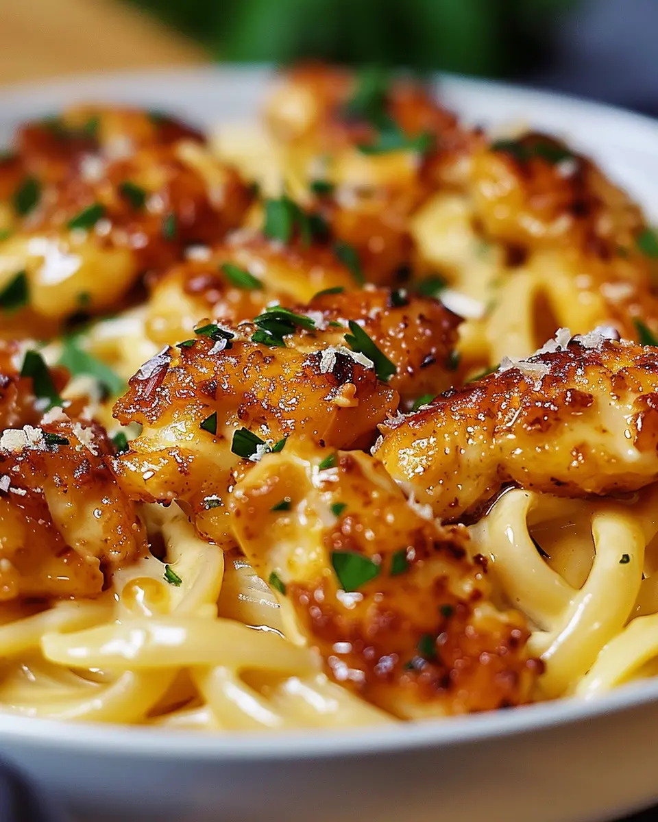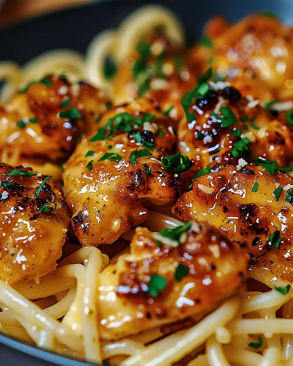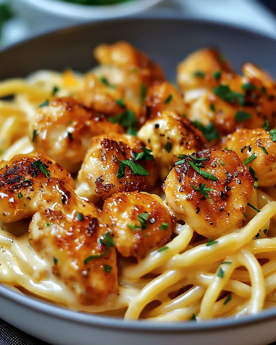 Deliciously rich and creamy garlic butter chicken bites served over savory Parmesan pasta.