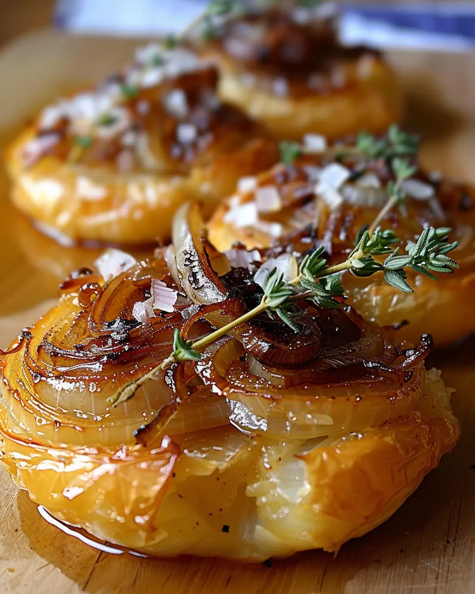 Presentation is key! To elevate your irresistible caramelized onion tarts, serve them on a rustic wooden board, garnished with fresh herbs like thyme or rosemary for a pop of color. Cut them into bite-sized pieces for easy sharing at gatherings. Consider pairing your tarts with a refreshing non-alcoholic beverage like sparkling water infused with citrus fruits or a homemade lemonade, offering a perfect balance to your savory dish.