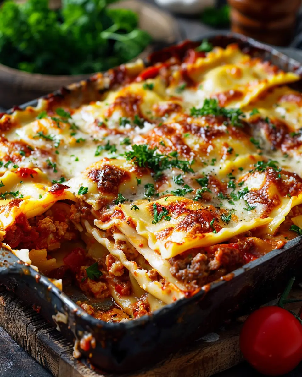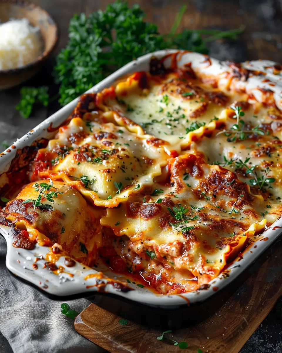 A comforting dish that combines layers of delicious ravioli, cheese, and sauces to create a hearty meal.