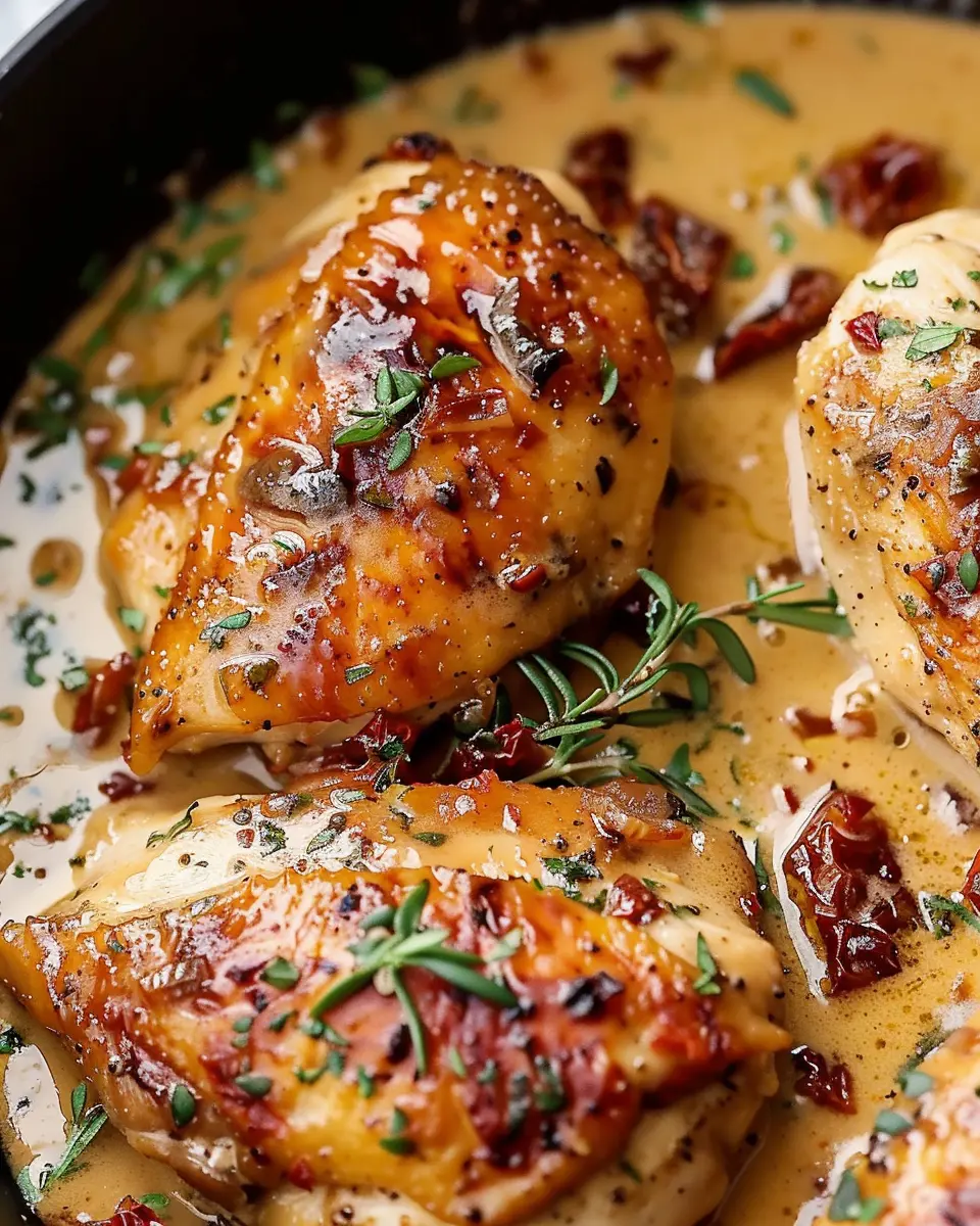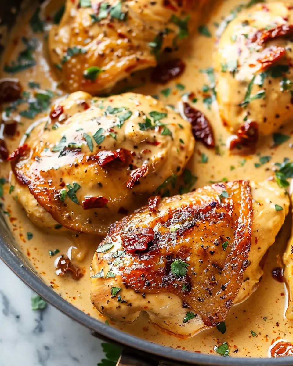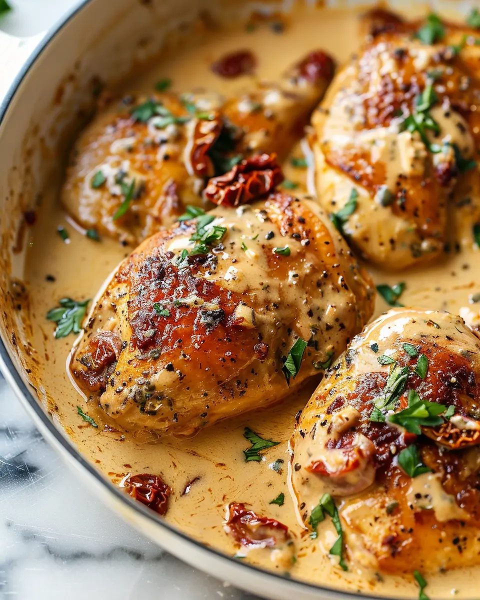 A rich and flavorful dish that combines juicy chicken with creamy sun-dried tomatoes, perfect for a romantic dinner.