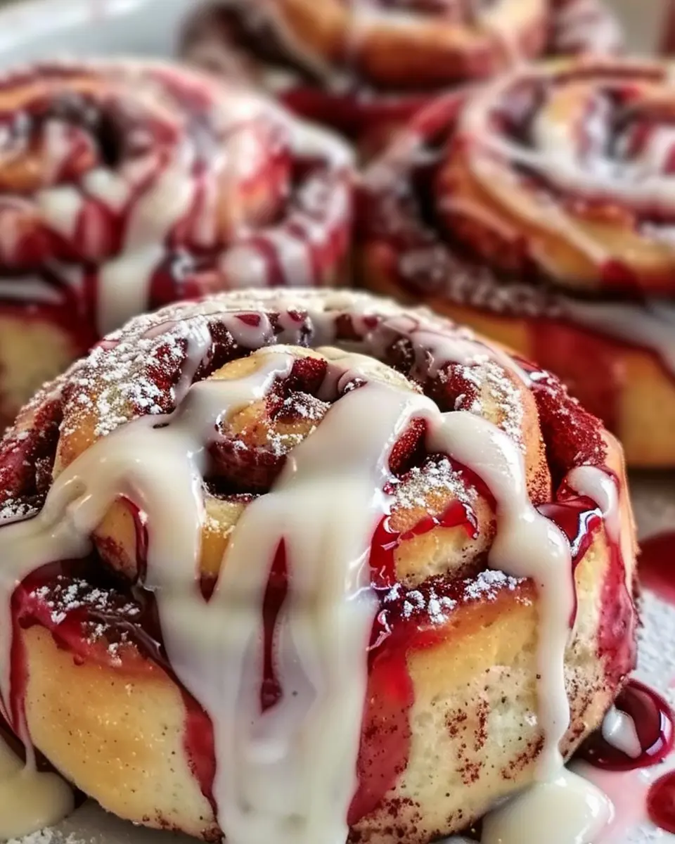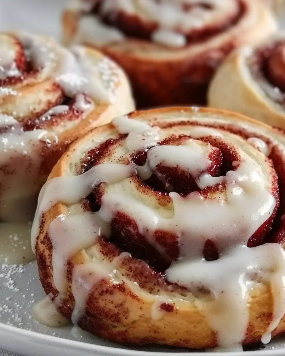 Indulge in the rich flavors of red velvet combined with the sweetness of cinnamon in these delightful rolls.