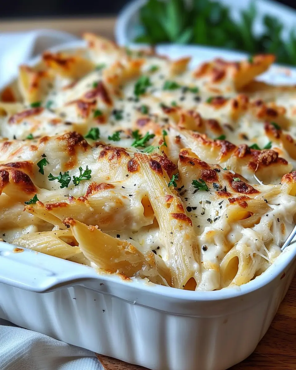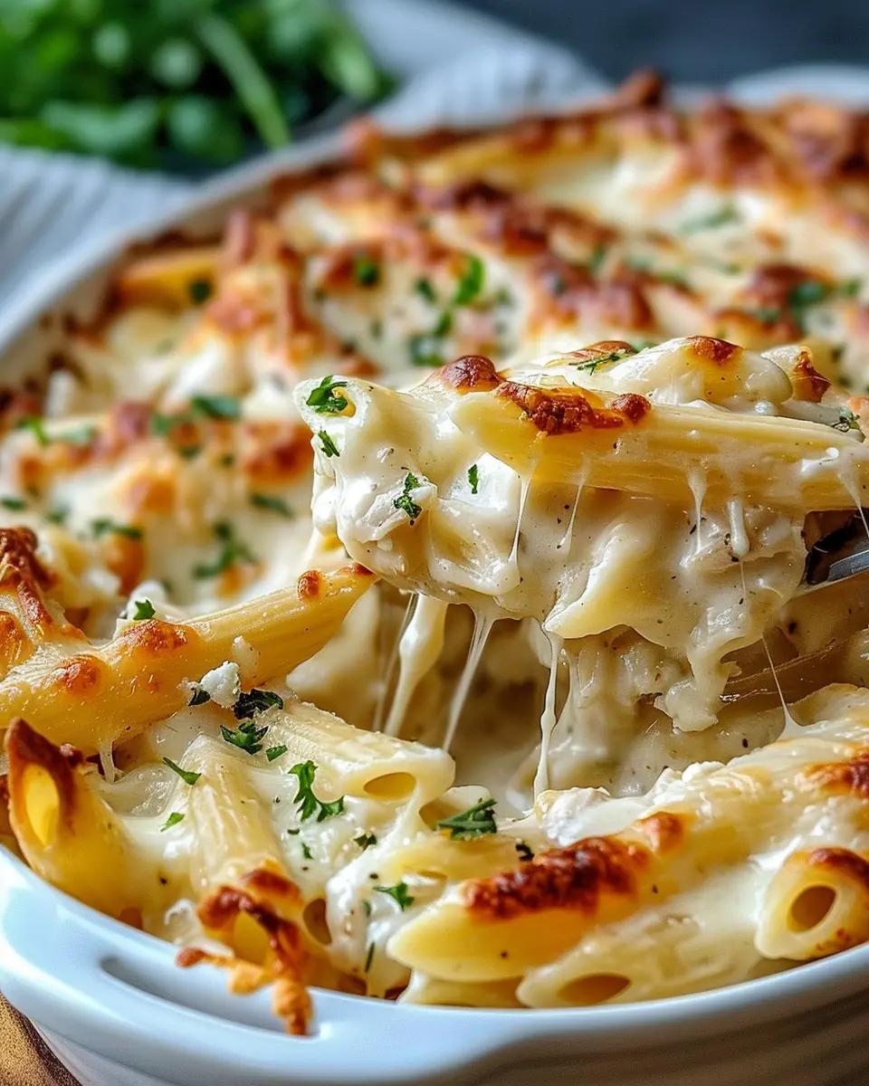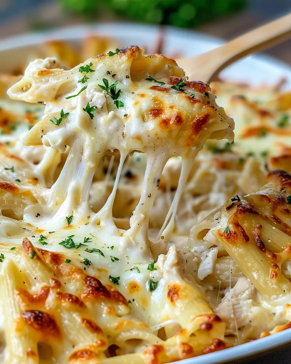 A creamy and delightful pasta bake made with roasted chicken and a rich alfredo sauce.