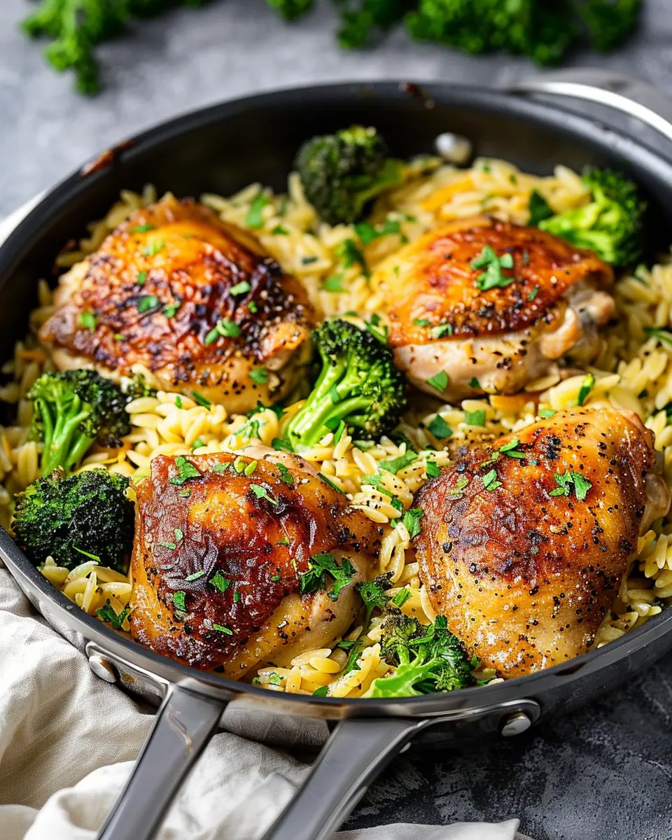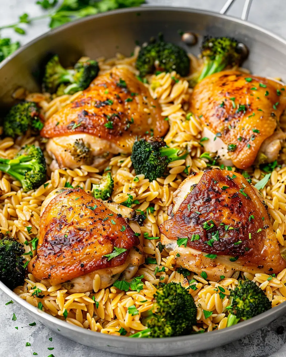 The actual cooking will take around 25–30 minutes. You’ll sear the chicken thighs in a skillet until they’re beautifully golden brown, then cook the orzo with broccoli right in the same pan to absorb all those delicious flavors. Efficient, right?