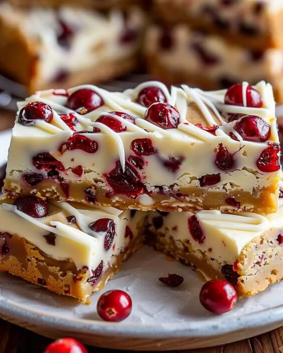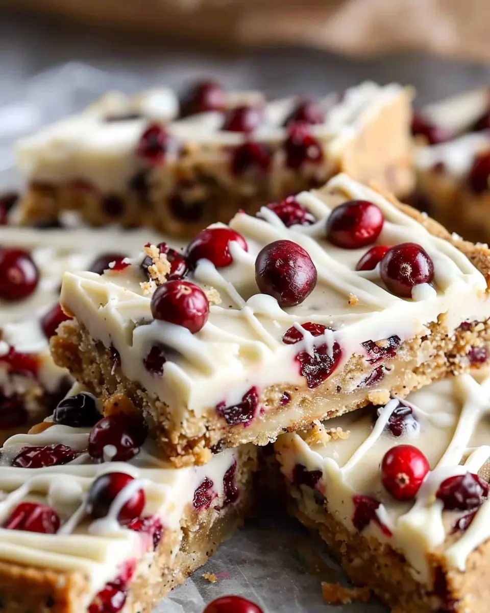 Once the bars are completely cool, it’s time to frost them! Spread the cream cheese frosting evenly over the top, allowing it to drape slightly over the edges. For a beautiful finish, sprinkle additional dried cranberries and white chocolate chips on top.