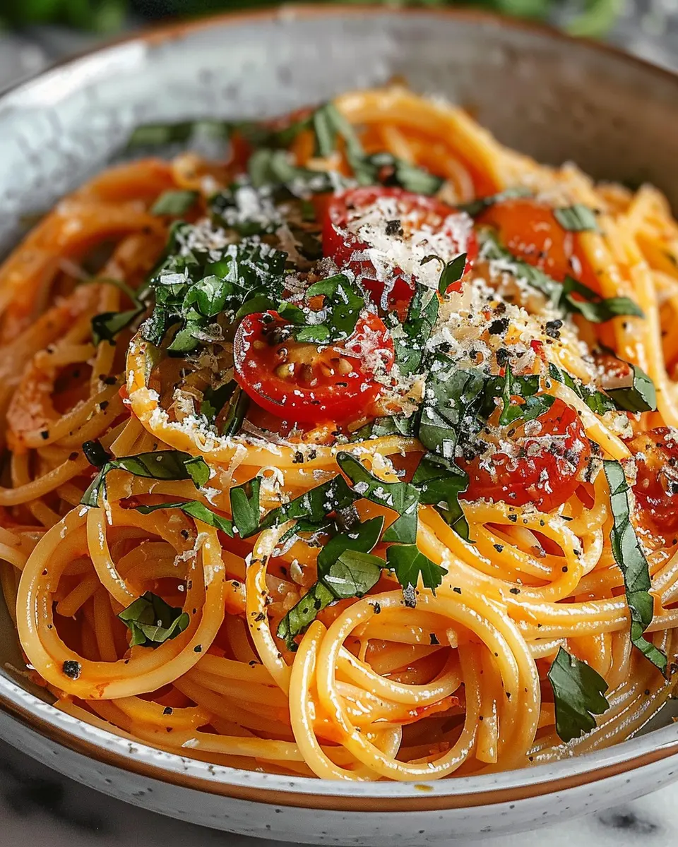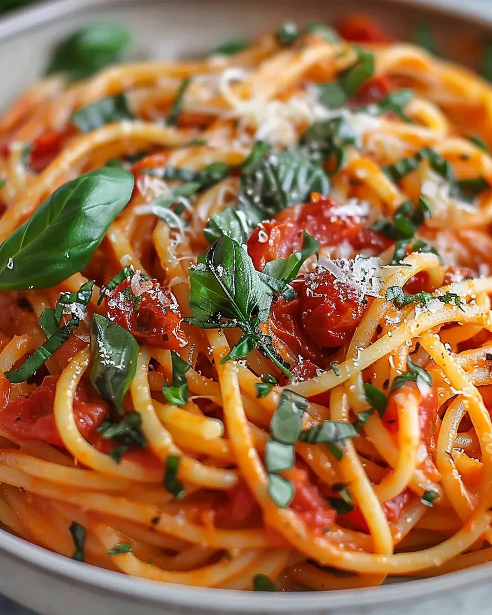 Once everything’s prepped, cooking takes just 15 minutes. You’ll simmer your tomatoes with garlic, cook the pasta, and combine it all for that perfect finish.